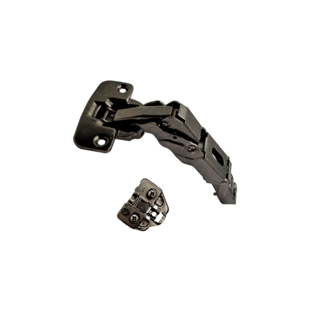 A 155° Soft Close Hinge, soft close integrated. Titanium black finish. This hinge comes with an adjustable hinge plate with euro grub style screws.