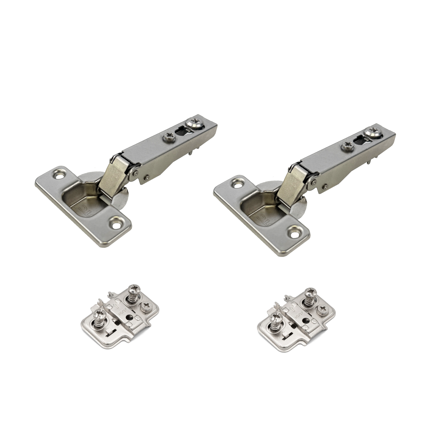 The Premio 110° soft close hinge offers precise full overlay door alignment with smooth, silent closing action. Finished in durable nickel, it features a anyway clip on euro screw adjustable plate for easy, accurate installation and adjustment. Supplied in a convenient 2-pack, these hinges provide reliable performance and enhanced cabinet longevity.