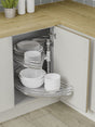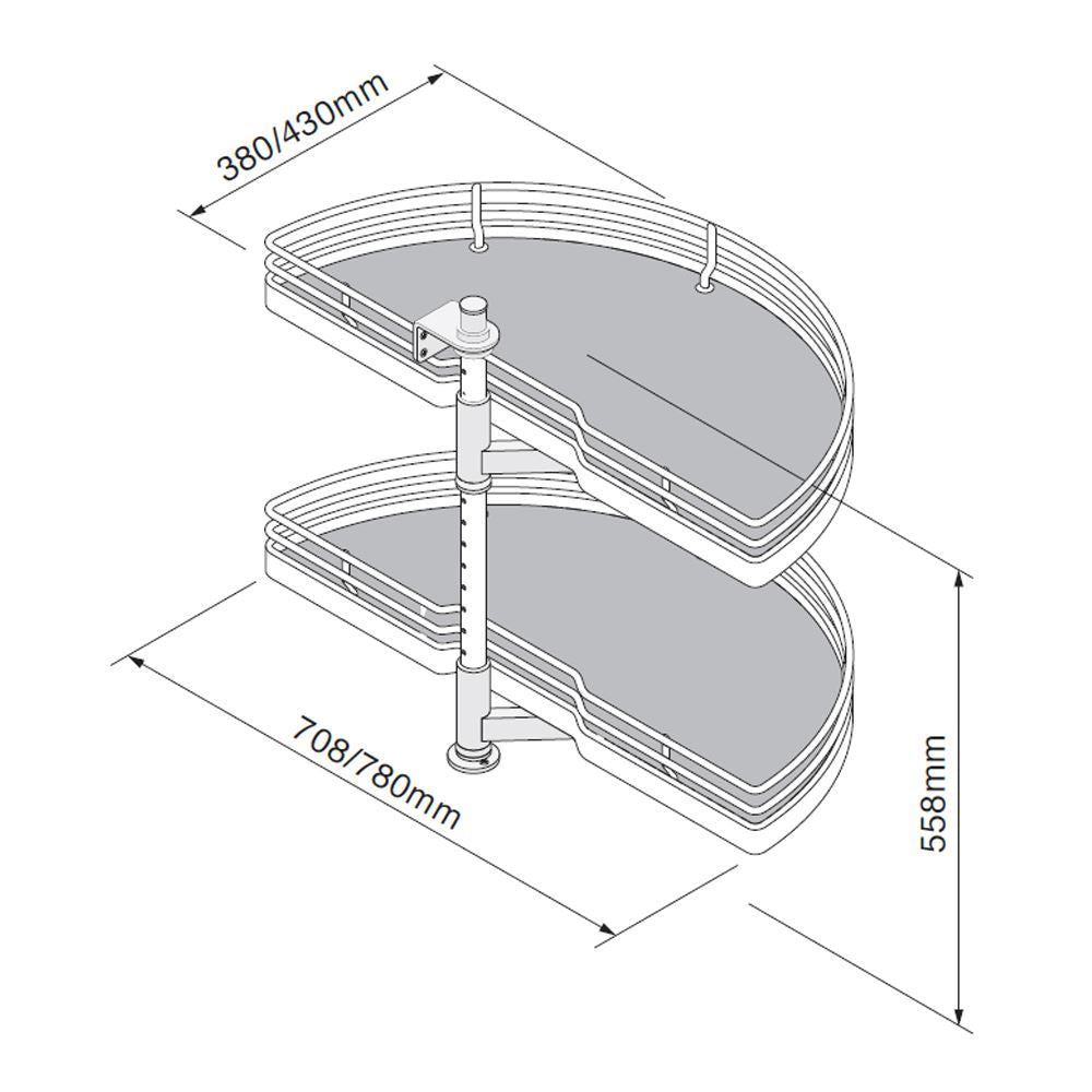 1/2 Carousel Plus unit to provide further storage and access into hidden corner cabinets. Units are available to suit 900/1000mm cabinets with door openings of 450/500mm. Shelves can be altered and fixed into several height positions.
